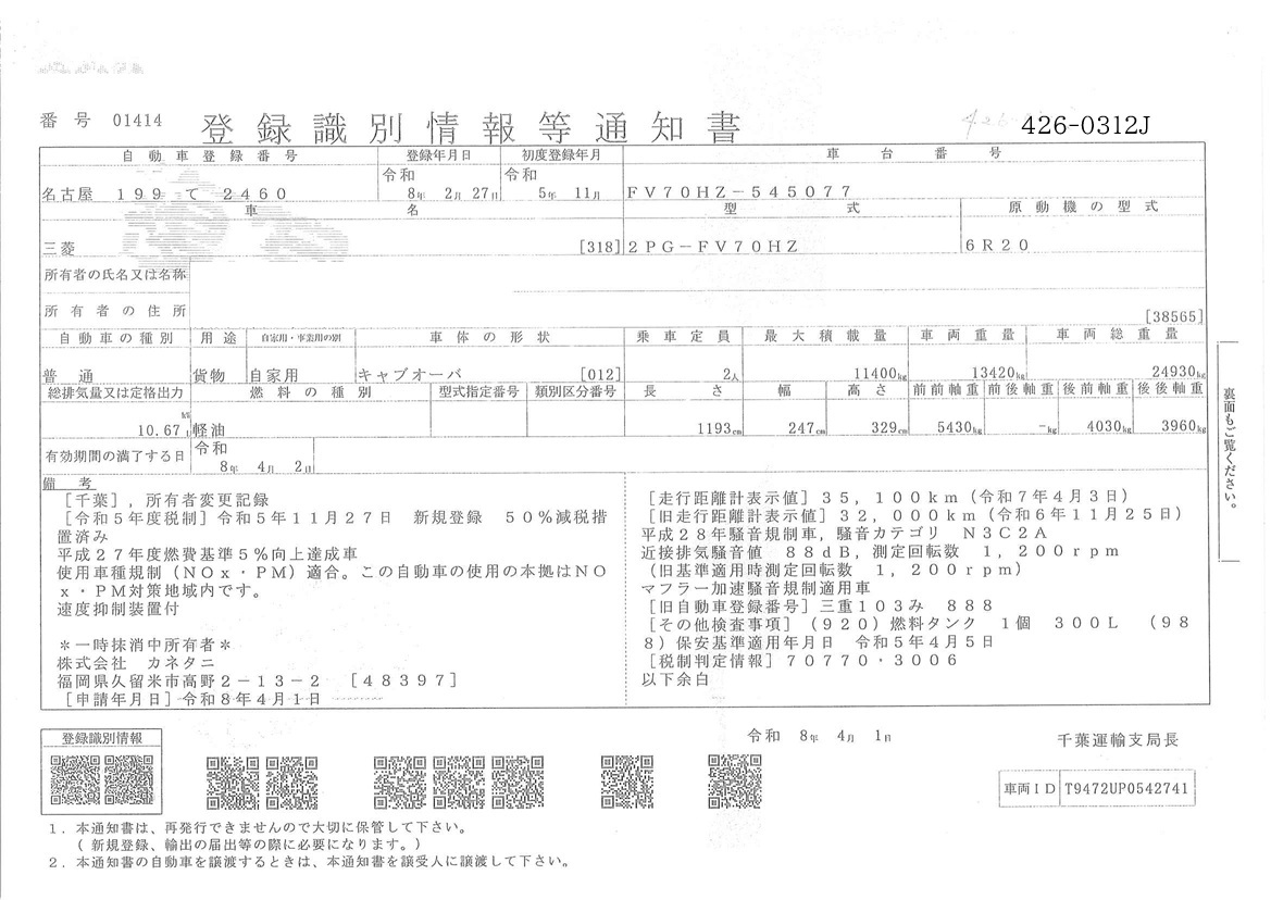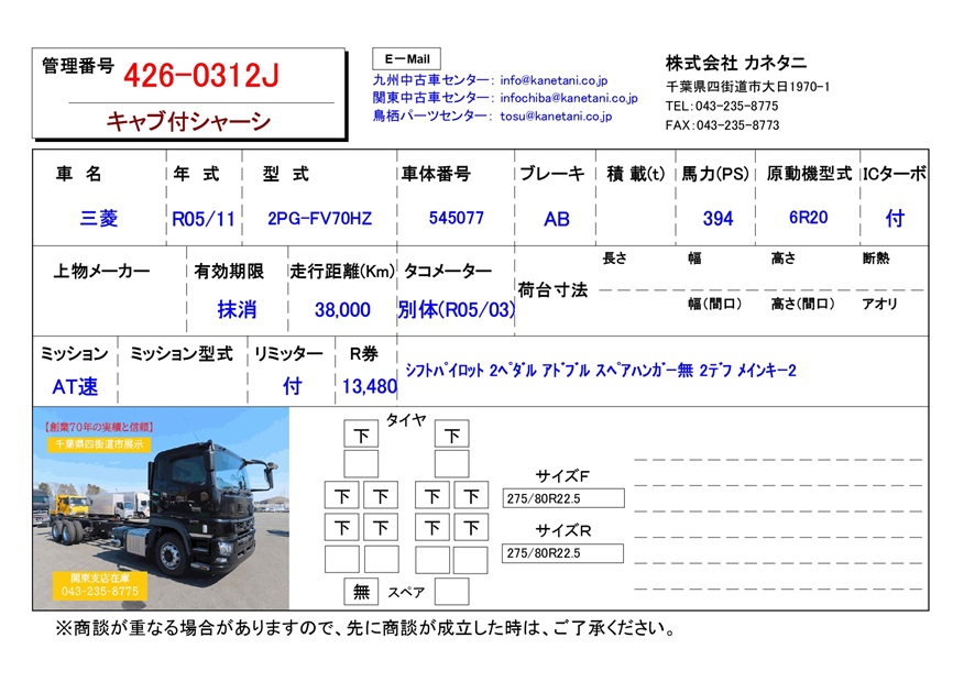 | 形状 | キャブ付シャーシ | 年式 | R05/11 |